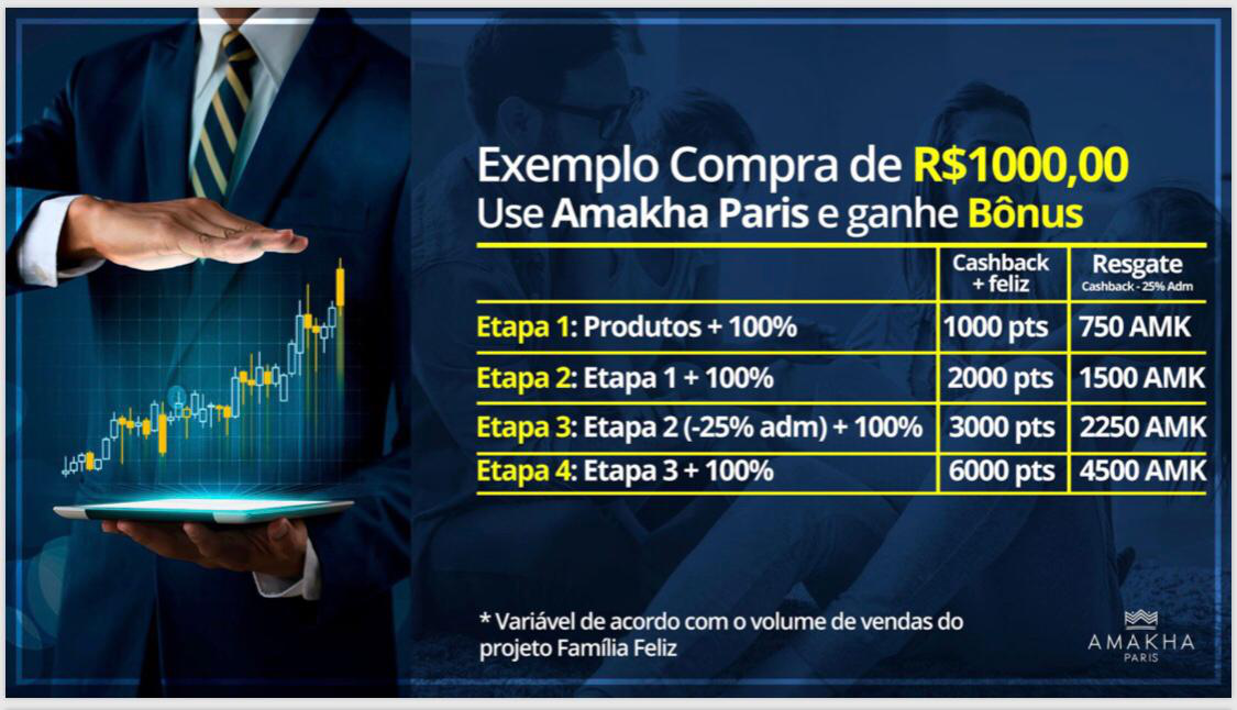 Você poderá receber, em bônus, até 400% do valor da sua compra, que pode ser usado para compra de novos produtos ou resgate em AMK no seu escritório da Amakha Paris.